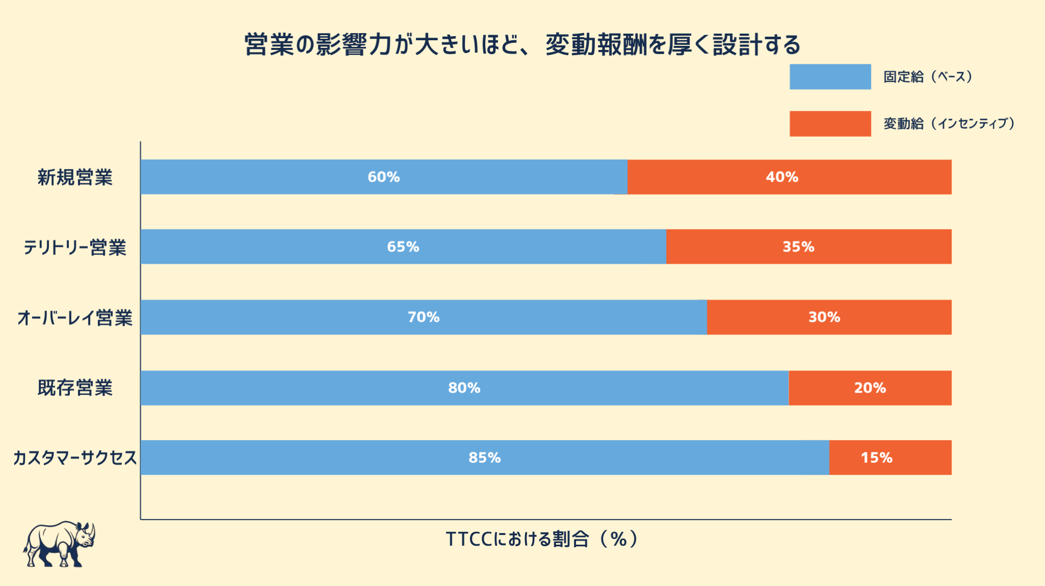 ペイミックスは、TTCC を基本給と目標変動給にどう配分するかを示す比率です。70:30 であれば、TTCC の70%が基本給、30%が目標変動給。60:40 なら、より変動の厚い設計になります。職種の影響力が大きいほど変動比率が厚い、というのが基本原則です。